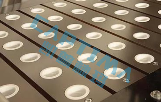 选项1:切割完成的片材形式,片材通过管体输送结构,通过伺服电机连接机械结构进行定点定时抓取,通过电热板进行杯盖膜烫压,中心定位精度:≤0.5mm,密封成品率:99%。
