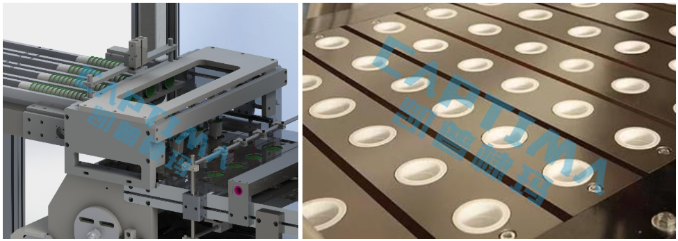 选项1:切割完成的片材形式,片材通过管体输送结构,通过伺服电机连接机械结构进行定点定时抓取,通过电热板进行杯盖膜烫压,中心定位精度:≤0.5mm,密封成品率:99%。